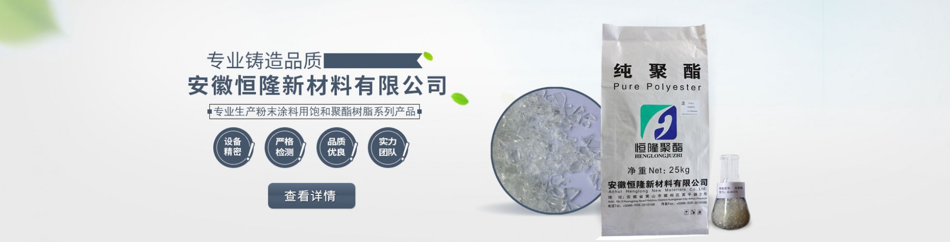 安徽恒隆新材料有限公司,位于全国知名的粉末涂料原料生产基地——安徽省黄山市徽州区,我公司专业生产粉末涂料用饱和聚酯树脂。 公司集研发和制造于一体,年生产聚酯树脂20000吨。近年来公司不断加大投入,拥有先进的生产和检验设备,标准的研发实验室,采用科学的管理方式,通过先进的自动控制系统对聚酯生产过程中的工艺条件和过程进行严格控制,生产的聚酯产品质量稳定。 公司秉承“科学管理、精心制造、优质服务、追求...